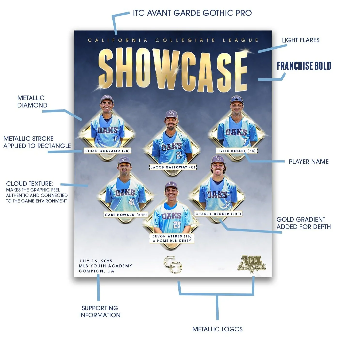 When I first heard about the CCL Showcase game, my mind immediately went to the idea of an "All-Star" event, and then to hardware, like trophies. I envisioned bringing that concept to life by adding metallic elements to the logos and incorporating diamond shapes with the players.
